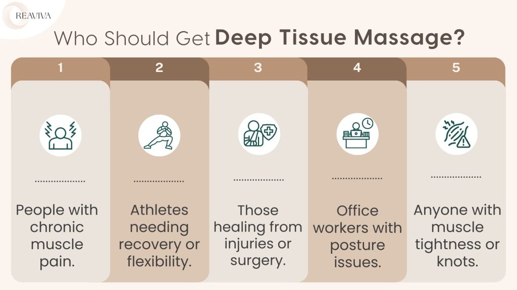 Deep tissue massage is a good choice if you have muscle pain, tension, or trouble moving easily. It’s not just about relaxing it’s about fixing problems in your muscles and helping your body feel better. Here are some examples of people who might need deep tissue massage: